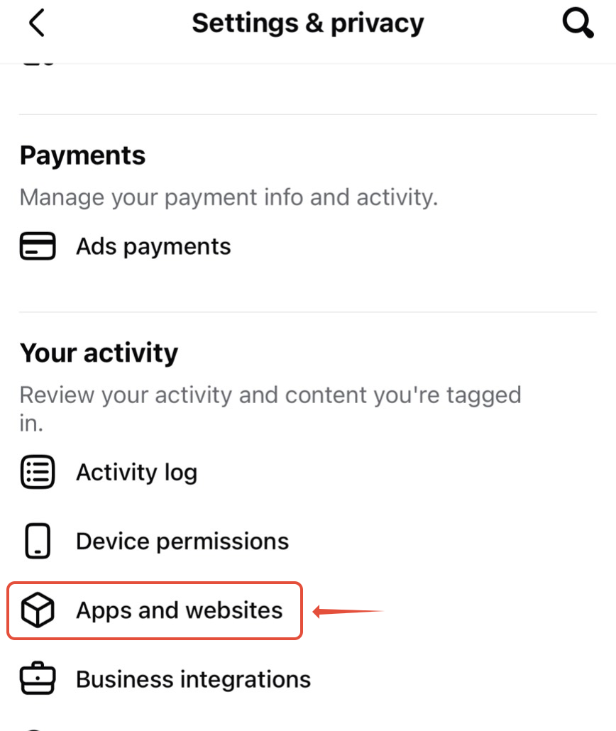 3. Pada halaman Settings & Privacy, gulir ke bawah ke bagian Your Activity, kemudian pilih Apps and Websites.
