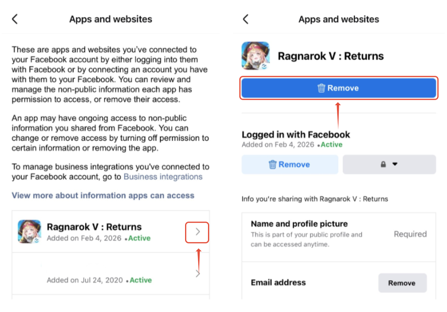 5. Jendela konfirmasi akan muncul yang menampilkan detail aplikasi yang dipilih. Untuk melanjutkan, konfirmasikan penghapusan dengan mengetuk tombol Remove sekali lagi. Sistem kemudian akan memberi notifikasi bahwa data aplikasi telah berhasil dihapus dari Facebook.