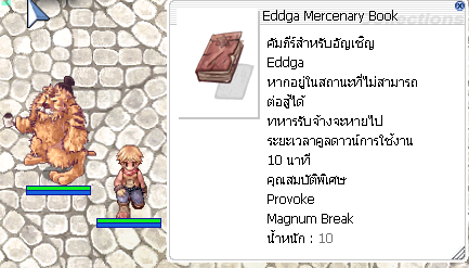 หนังสือเรียกทหารรับจ้างนี้เป็นไอเทมถาวร หาก Eddga ตายก่อนหมดอายุการใช้งาน ไอเทมจะไม่หายไป สามารถเรียกทหารรับจ้างได้ทุก ๆ 10 นาทีตามระยะเวลาคูลดาวน์ที่กำหนด