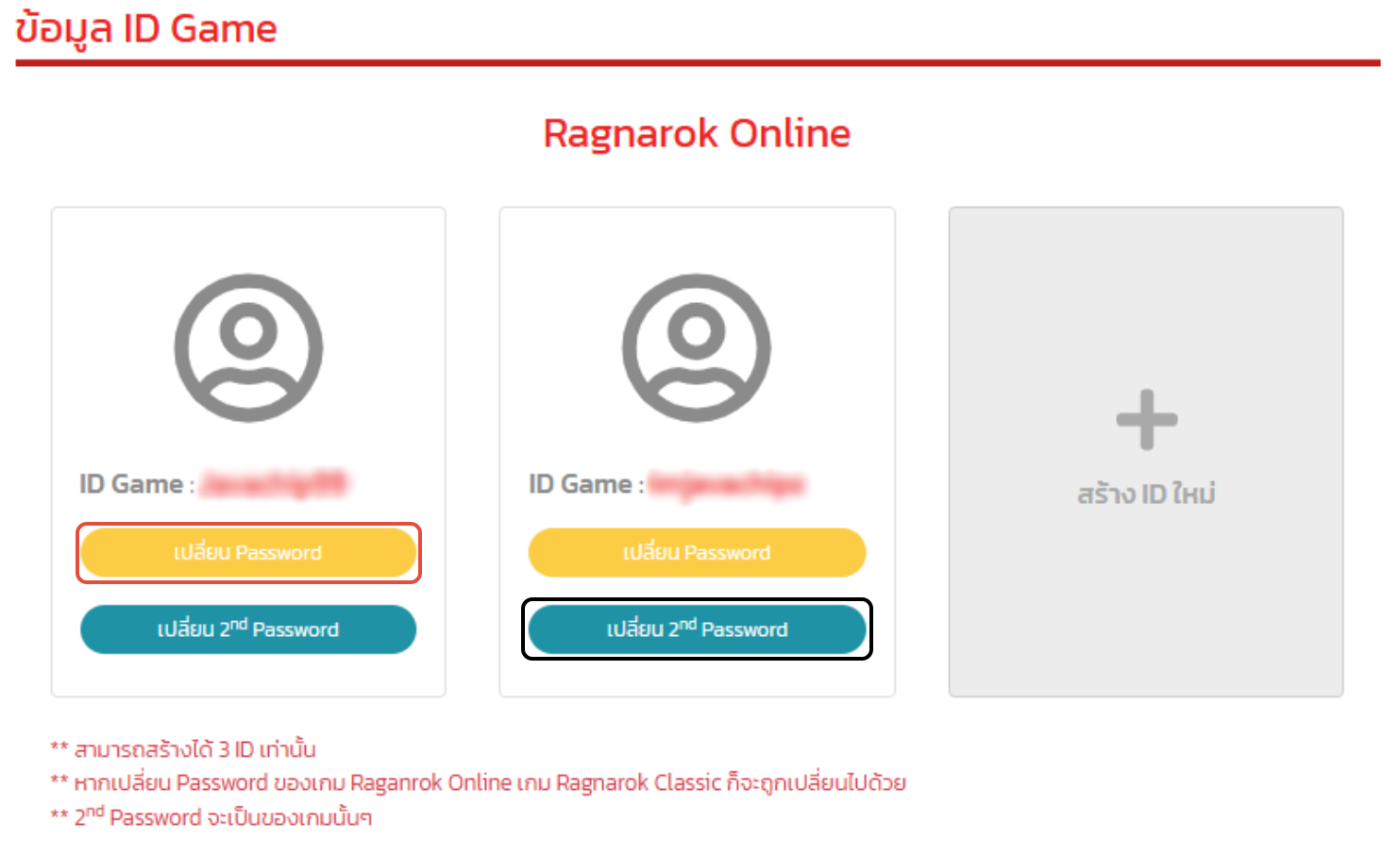 ** หากเปลี่ยน Password ของเกม Raganrok Online เกม Ragnarok Classic ก็จะถูกเปลี่ยนไปด้วย** 2nd Password จะเป็นของเกมนั้นๆ
