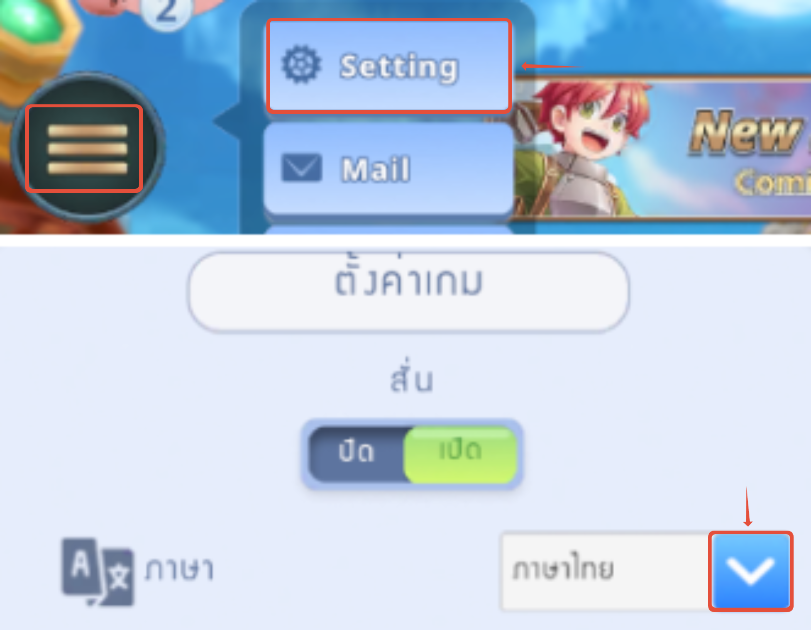 : ไปยังเมนู Menu icon (≡) → Setting (ตั้งค่า) → ตั้งค่าเกม และเลือกเปลี่ยนภาษาในช่องตามภาพ