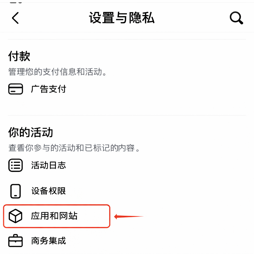 3. 在 “设置与隐私” 页面中,向下滚动至 “你的活动” 部分,并选择 “应用和网站”。