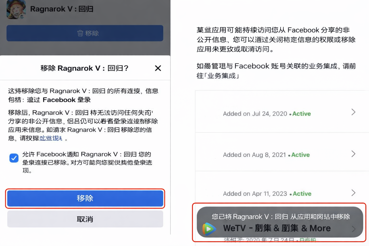 5. 系统将弹出确认窗口,显示所选应用的相关信息。请再次点击 “移除” 按钮以确认删除。随后,系统会提示该应用的数据已成功从 Facebook 中移除。